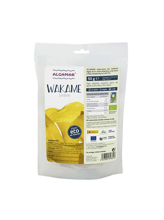 Alga atlântica silvestre seca. A alga wakame é rica em cálcio, iodo, proteínas e fibra, é uma das mais apropriadas para consumir crua em saladas, e para se iniciar na culinária com algas, pela sua grande versatilidade: em sopas, arroz, com outras verduras, no forno, simplesmente fervida, em recheios de empadas, etc.