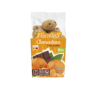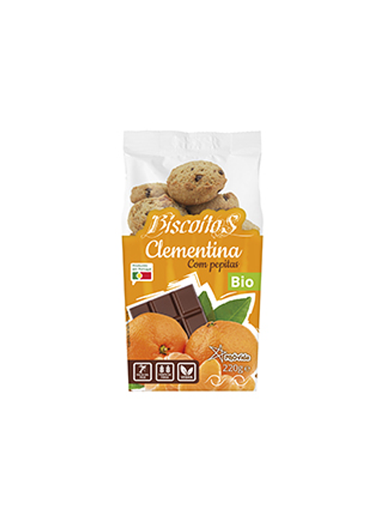 Biscoitos de Clementina c/pepitas de Chocolate.Sem óleo de palma. Vegan. Fonte de fibra. Ingredientes: Farinha de TRIGO ESPELTA*, farinha de TRIGO ESPELTA integral*, açúcar mascavado*, água, óleo vegetal de girassol*, bebida de AVEIA* (água, AVEIA*(10%), óleo de girassol*, sal marinho*), óleo de coco desodorizado*, pepitas de chocolate*(5,6%) (pasta de cacau*(47,5%), açúcar*, manteiga de cacau* (5,8%), emulsionante:leticina de SOJA*), compota de clementina* (2,1%) (açúcar de cana*, clementina*(47%), gelificante:pectina de fruta*, acidificante: concentrado de sumo de limão*), levedante: bicarbonato de sódio, sal marinho, essência de laranja*, fibra alimentar-inulina*. *de produção biológica.Pode conter vestígios de Amendoim, Leite, sementes de sésamo, tremoço e frutos de casca rija. Origem:UE/não UE. PT-BIO-04.