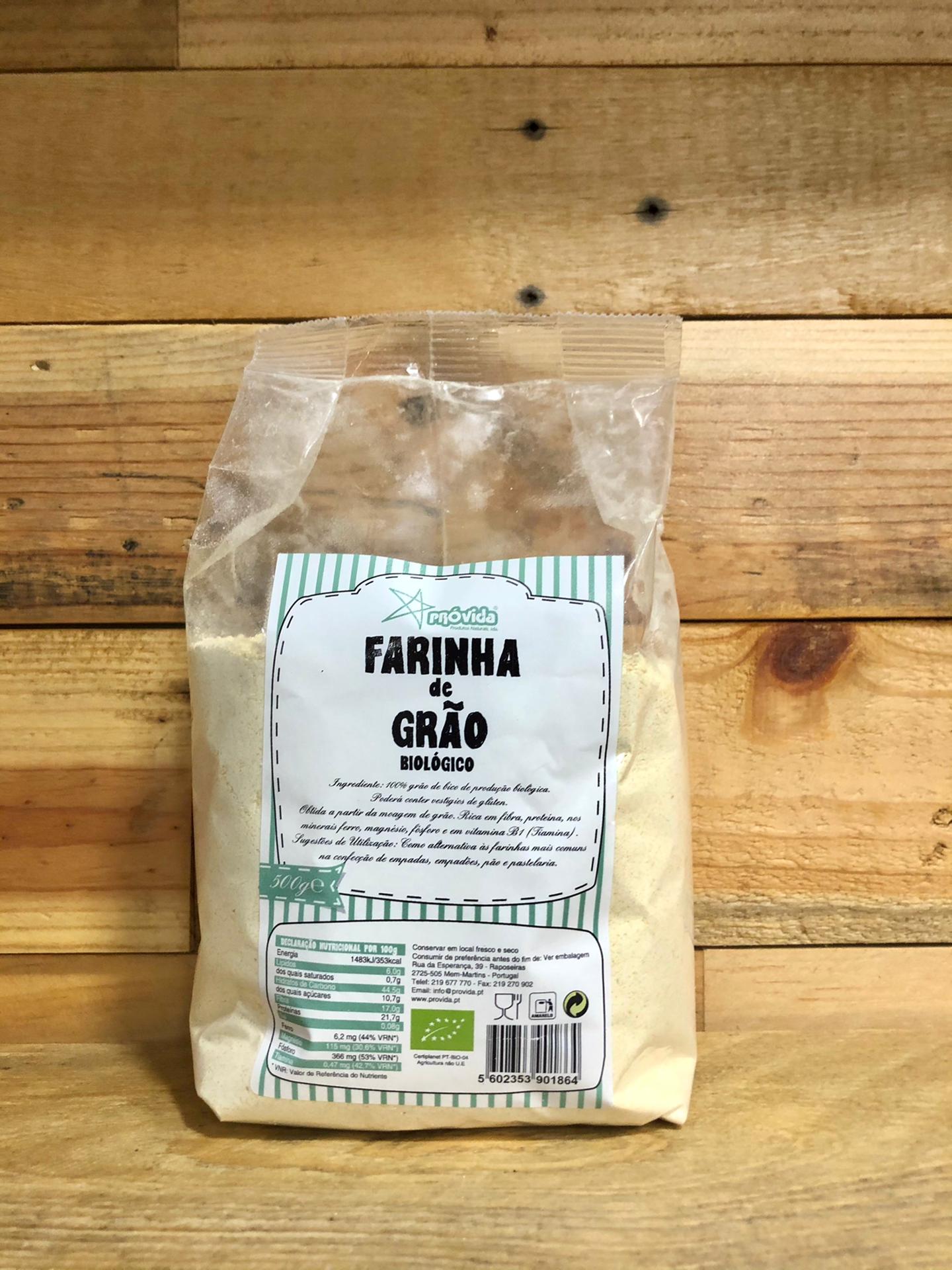 Ingredientes: 100% grão de bico de produção biológica. Certiplanet, PT-BIO-04, Agricultura não UE. Poderá conter vestígios de glúten. Obtida a partir da moagem de grão. Rica em fibra, proteína, nos minerais ferro, magnésio, fósforo e em vitamina B1 (Tiamina).