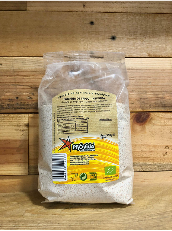 Farinha de Trigo tipo 150 para usos culinários. Obtida a partir da moagem do cereal integral de produção biológica. Alto teor em fibra e fonte de proteína. Certiplanet, PT-BIO-04, Agricultura UE.