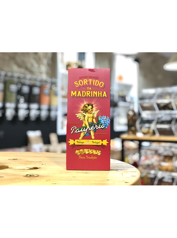 O tradicional sortido da Paupério embalado numa linda caixa de design vintage, dedicada à Madrinha. A caixa contem uma variedade de 16 biscoitos distintos. Fidalguinhos, biscoitos de milho, biscoitos de chocolate ou biscoitos secos, podem ser encontrados no seu interior.